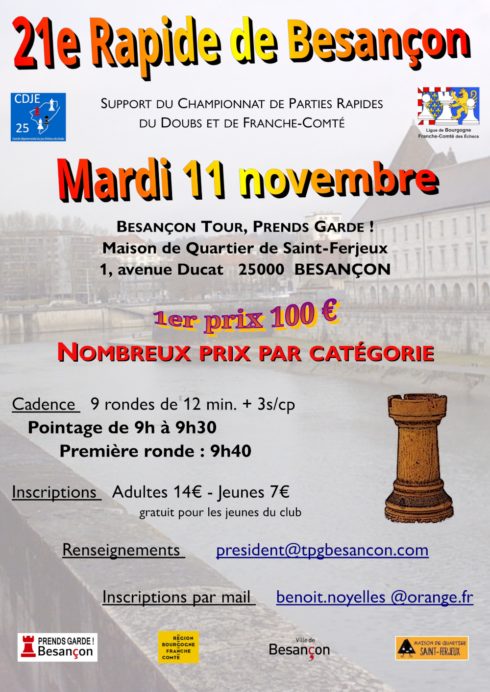 Le club Besançon Tour, Prends Garde ! organise le mardi 11 novembre, à la Maison de Quartier de Saint-Ferjeux (1 Avenue Ducat, 2500 Besançon), le 21ème Rapide de Besançon, support du Championnat de Parties Rapides du Doubs et de Franche-Comté.