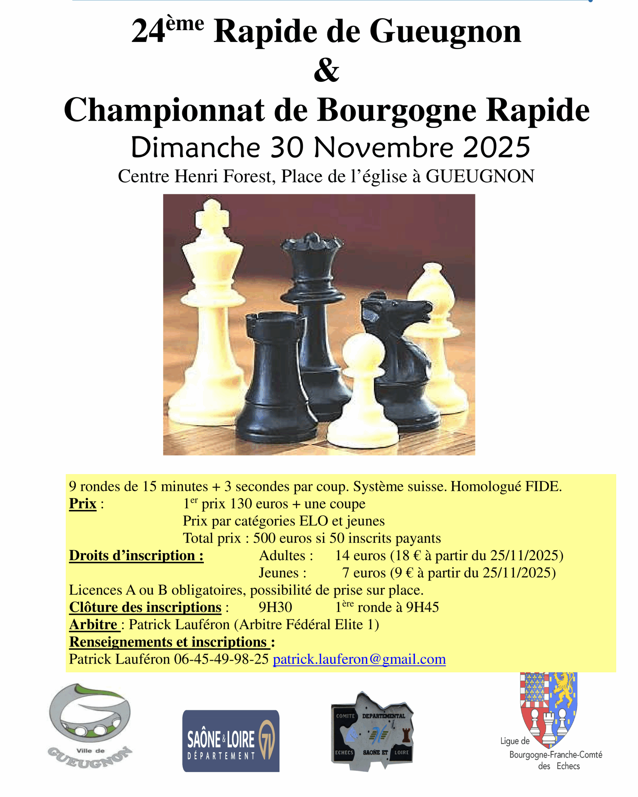 Le 24ème rapide de Gueugnon aura lieu le dimanche 30 novembre 2025 au Centre Henri Forest à Gueugnon et sera support du championnat de Bourgogne rapide.
